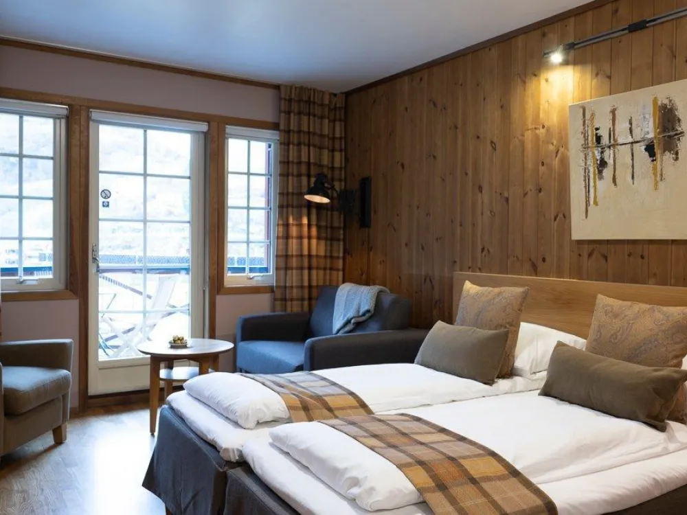 Our standard twin rooms have room for one extra bed and is suitable for three people. The room is 18 square meters and have two single beds put together. Enjoy beautiful views of the Aurlandsfjord and Flåm harbor from the private balcony or terrace. The room has a rustic and traditional style, yet modern and delicate.